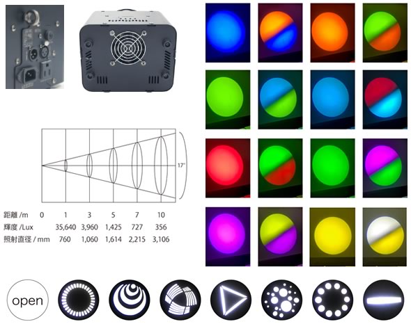 本体内部にカラーホイールx1、ゴボホイールx1、3ファセットプリズムを備え、キレのある動きで多彩な演出を可能としました。