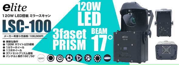 e-lite「LSC-100」は光源に120WホワイトLED(色温度6000K)と機敏な動作のミラーを搭載したコンパクトなLEDミラースキャナー。