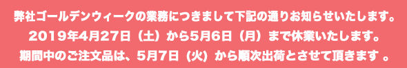 ゴールデンウィーク連休期間中のご注文は5月7日(火)より順次発送となります。