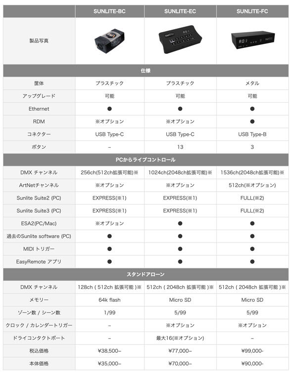 以前の記事でもご紹介したSUNLITE-BC と本日ご紹介した2機種の機能を以下にまとめました。