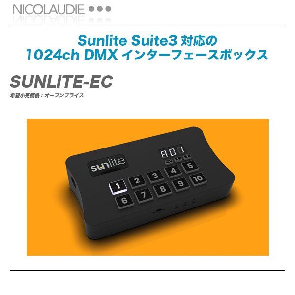 NICOLAUDIE「SUNLITE-EC」は、PC接続で 1024 のDMX チャンネルが操作可能なSunlite Suite3 EXPRESS搭載の最新世代の DMXインターフェースです。 軽量コンパクトなボディに、4 つの XLRコネクターやバックライト付きキーボードを搭載し、Sunlite Suite 3をパワフルに簡単に使用することが可能です。 追加オプションで DMXチャンネルを2048チャンネルへ拡張、オプションでFULLバージョンでソフトウェアを使用することができます。