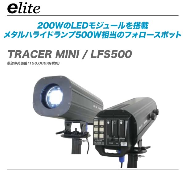 e-lite『LFS500 / TRACER MINI』は200WのLEDモジュールを搭載し、メタルハライドランプ500W相当の出力のフォロースポットです。シンプルなマニュアル制御のディマー、アイリス、フォーカス、カラーチェンジを備えた柔軟な操作性で、ズーム範囲は9.2°から14.2°投影はどんな角度でも鮮明です。
