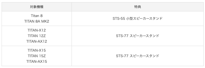 TITAN Seriesの対象機種を1 ペアご購入につき、スピーカースタンドを無償進呈いたします。